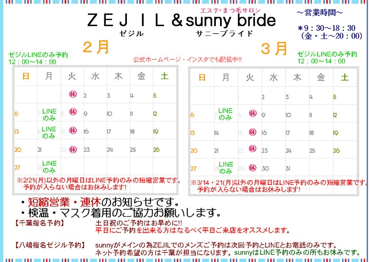 2月 3月の営業日カレンダー~滝沢 盛岡 メンズ バーバー 美容 ソフトツイストパーマ ヘッドスパ