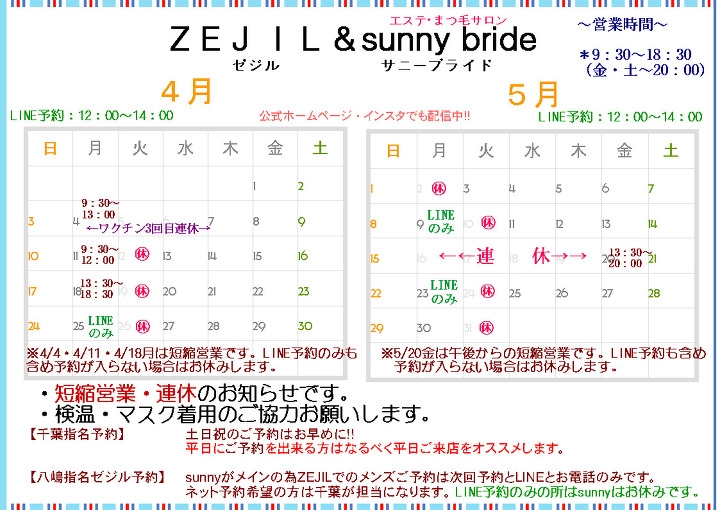 4 5月の営業カレンダー~滝沢市 盛岡 バーバー メンズパーマ プランプラッシュリフト ブライダルエステ ゼジル サニーブライド~