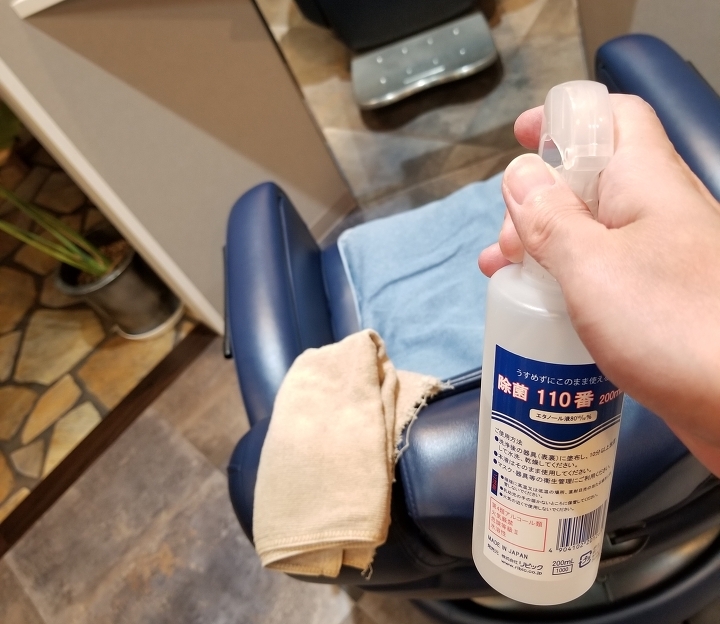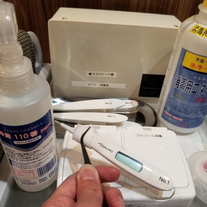・今月から、脇で測る体温計に変更させていただきました。お客様の前でアルコール消毒をしております。