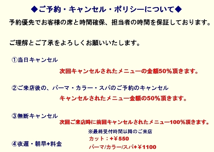 ご予約キャンセルや当日変更をしたときはどうなるのかというを個別で対応してましたが詳細を伝えきれていなかった方もおりますのでこの場を持ちまして規定をアップしますので、よろしくお願い致します。