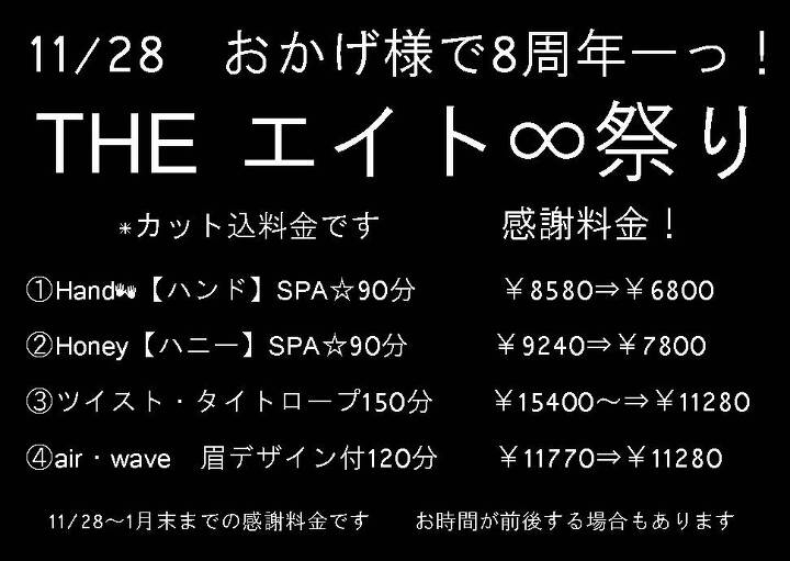 11/28 8周年ーっ!THEエイト祭り~滝沢市 盛岡市 メンズサロン バーバー 理容師 美容師 パーマ ツイスト エアウェーブ ハニースパ シェービング プランプラッシュリフト まつ毛カール ~