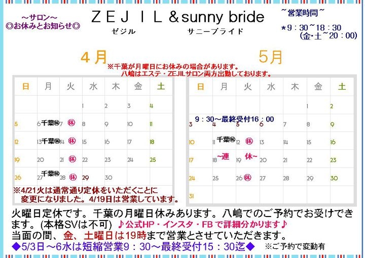 GWはステイ・ホーム週間となりましたが、短縮営業の中でZEJIL/sunnybrideにお時間を作ってご来店いただきましてありがとうございます。