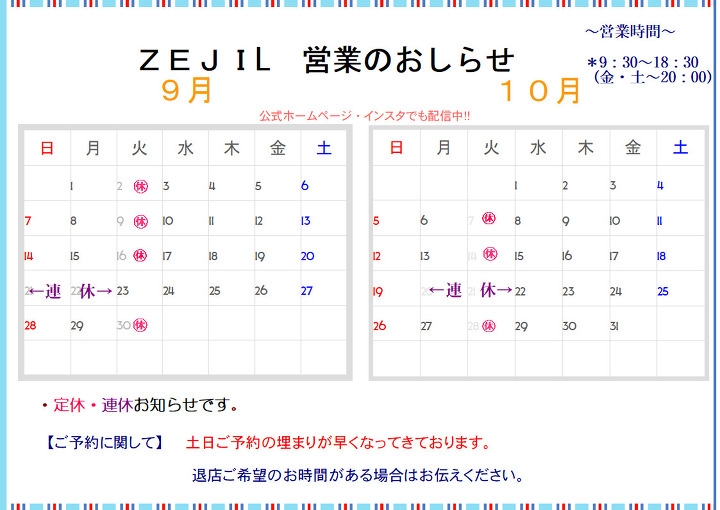 9月10月営業カレンダー〜メンズ美容室 バーバー 滝沢市 盛岡市 ツイスパ シャドウ フェザー パーマ〜