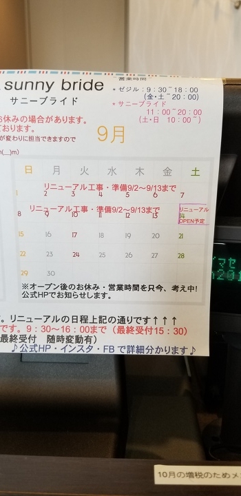 9/14からオープン予定ですので、誠にご迷惑をおかけしますがどうぞよろしくお願い致します。
