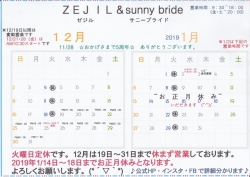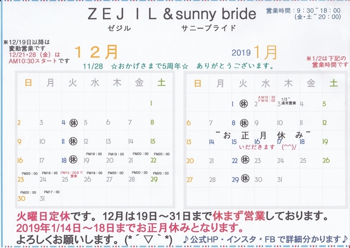 ☆2018 12月&年末年始の営業時間&2019・1月のお休み☆ ~盛岡 滝沢 せいほくタウン内 バーバショップ サニーブライド ブライダルエステ~