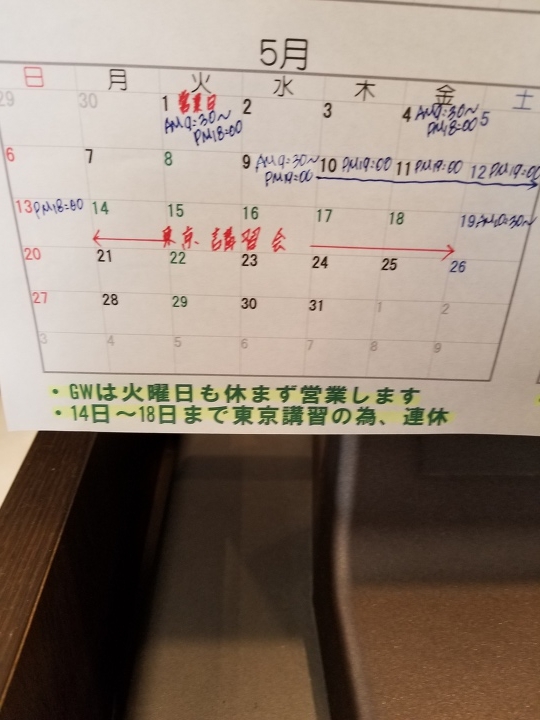 ③ 5/14(月)~5/18(金)まで東京講習会の為、連休 5/19(土) 10:30~営業開始