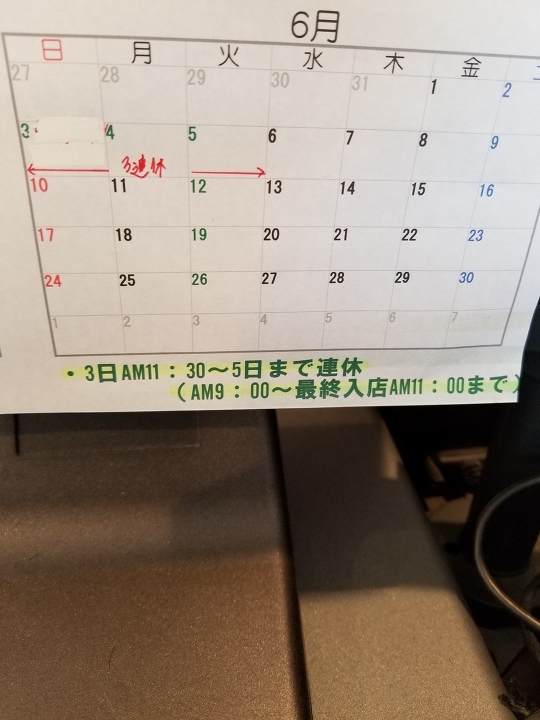 6/3(日)~6/5(火)まで3連休となります。