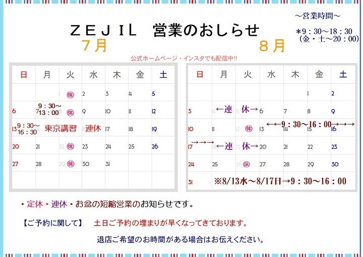 7月8月営業カレンダー~メンズ美容室 バーバー ツイスパ シャドウ 波巻き フェザー パーマ シェービング~